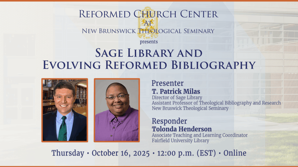 While the vision, and many other things, have changed, Gardner A. Sage Library is still with us. Its history and the changing understanding of the role of libraries in theological education will be the subject of our next Reformed Church Center program, “Sage Library and Evolving Reformed Bibliography,” to be held online on Thursday, October 16, 12:00 noon to 1:30 pm Eastern Time.